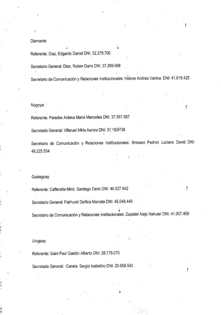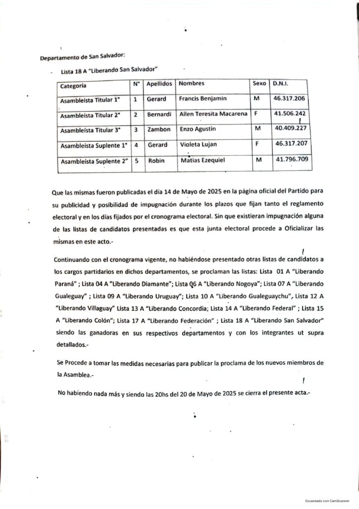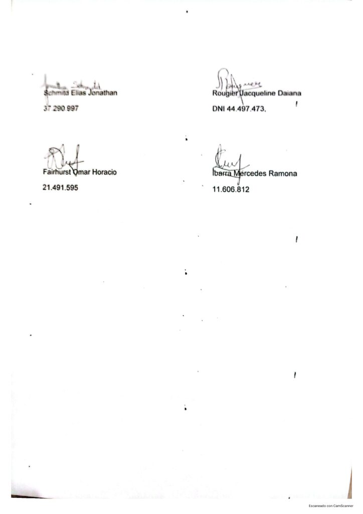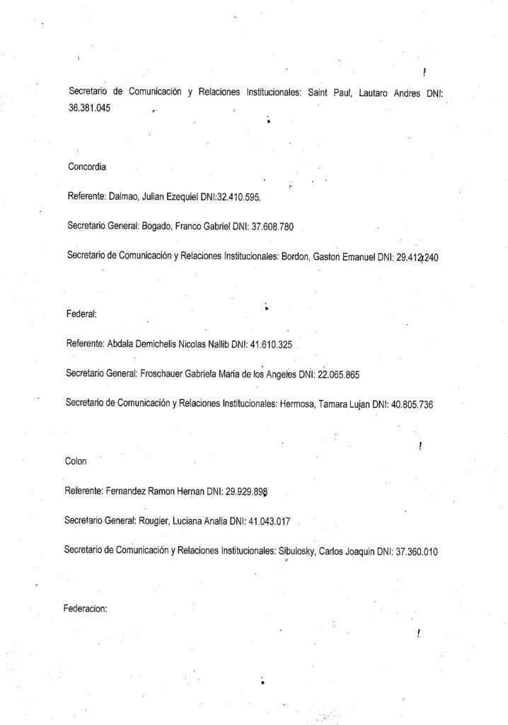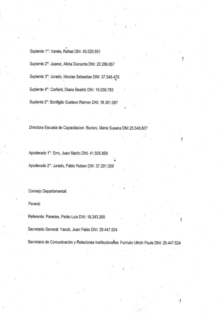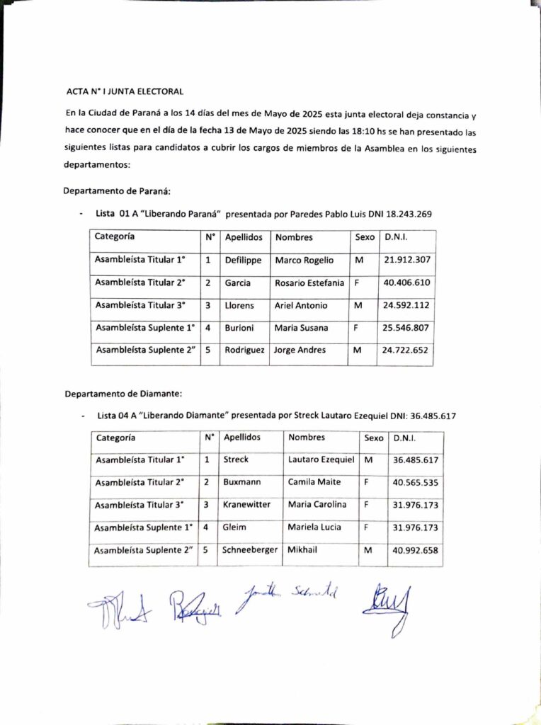 JUNTA ELECTORAL: DESIGNACION–LUGAR DE FUNCIONAMIENTO- DIAS Y HORARIO- • 1) Schmidt Elias Jonathan, DNI 37.290.997 2) Fairhurst Omar Horacio, DNI 21.491.595; 3) Ibarra Mercedes Ramona, DNI 11.606.812 4) Rougier Jacqueline Daiana, DNI 44.497.473 , domicilio Calle Monte Caseros 626 de la ciudad de Paraná, del día 12 al 16 de Mayo en el horario de 11 a 13 y de 18 a 20 horas.
