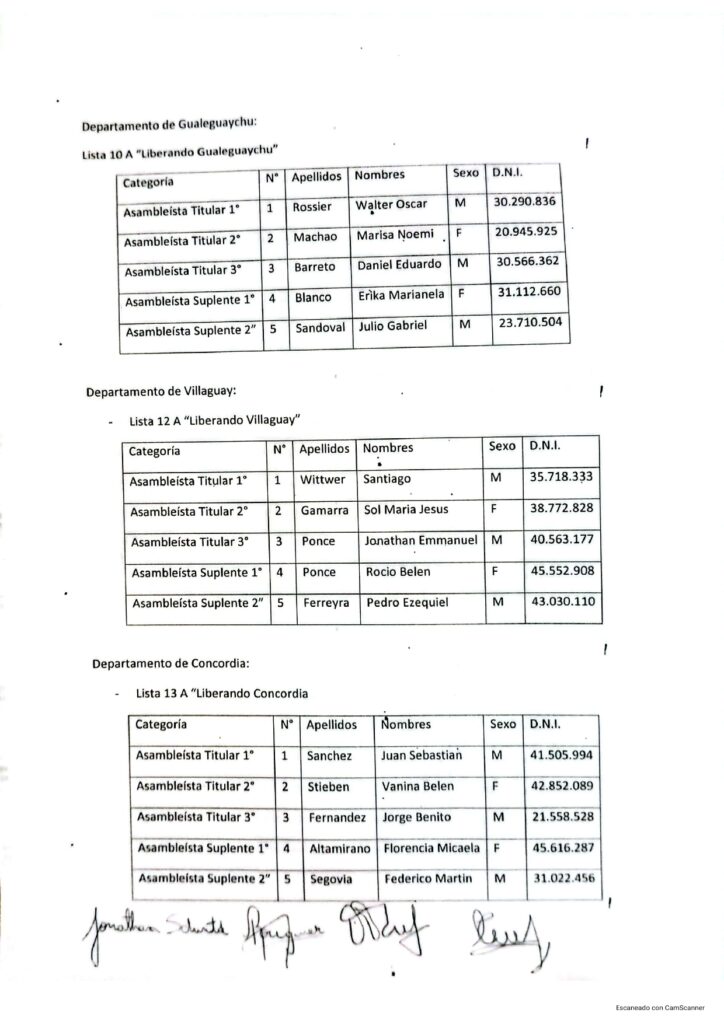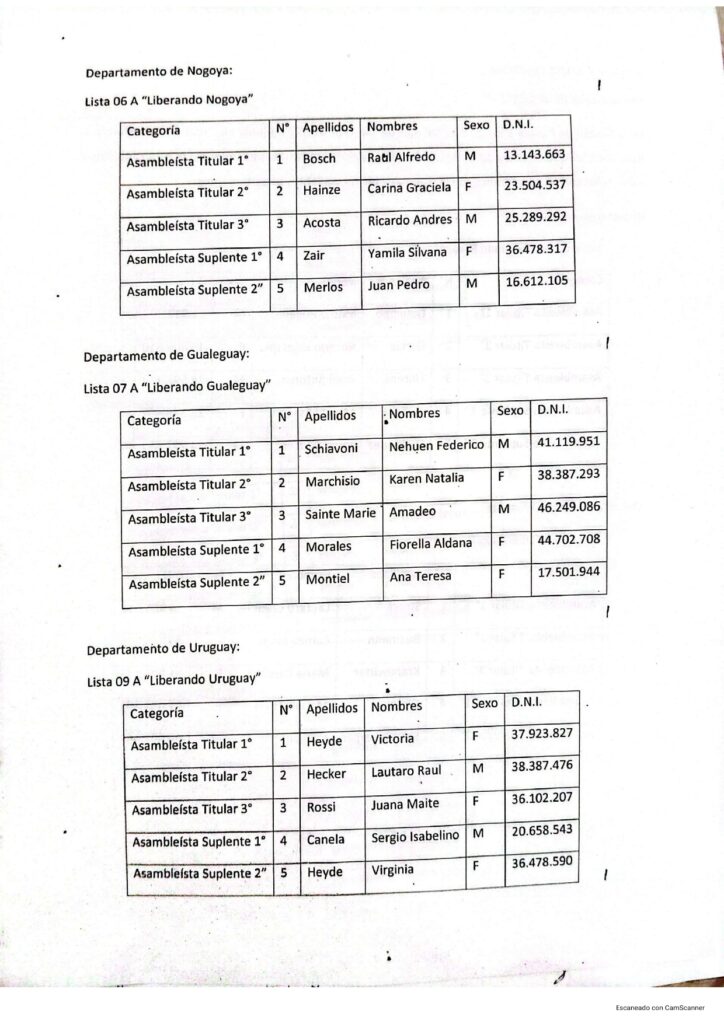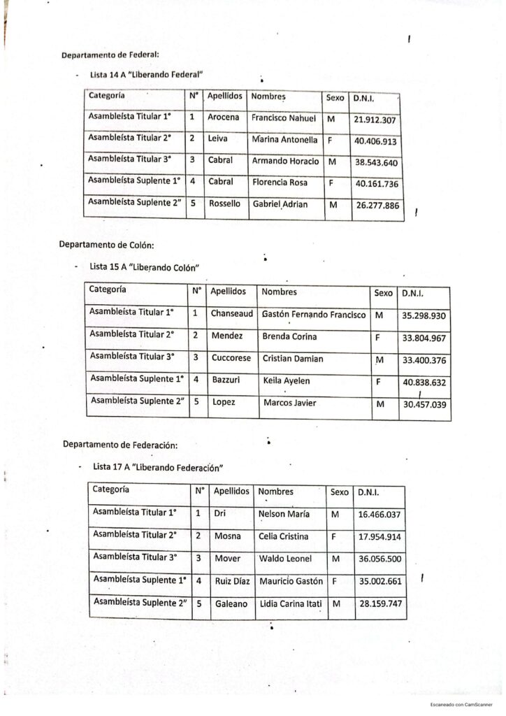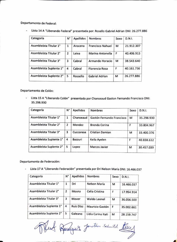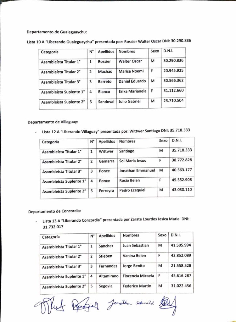 Elección miembros de ASAMBLEA: Cargos a cubrir por departamento: 3 Asambleístas titulares y 2 Asambleístas suplentes (siempre respetando la paridad de género acorde a la ley 27412). Departamentos: 1) Paraná: Monte Caseros 626 de la ciudad de Paraná; 2) Islas del Ibicuy: Monte Caseros 626 de la ciudad de Paraná; 3) Gualeguaychú: Calle J.J. Franco 2517 de la Ciudad de Gualeguaychú, 4) Gualeguay: calle San Antonio Sur 317 de la ciudad de Gualeguay; 5) Nogoya: calle Moreno N°161 de la ciudad de Nogoyá; 6) Villaguay: calle Rocamora N° 623 de la Ciudad de Villaguay; 7) Concordia: calle San Lorenzo Oeste N° 556 de la Ciudad de Concordia; 8) Colón: Mitre 1339 de la Ciudad de San José; 9) Uruguay: Calle San Martin 1156 de la Ciudad de Basavilbaso; 10) Federación: Av. San Lorenzo 50, ciudad de Federación; 11) Federal: Calle Los Eucaliptus 378 de la Ciudad de Federal; 12) Tala: Monte Caseros 626 de la ciudad de Paraná; 13) Diamante: Calle presidente Perón 129 de la Ciudad de Gral. Ramírez; 14) San José de Feliciano: Monte Caseros 626 de la ciudad de Paraná; 15) Victoria: Monte Caseros 626 de la ciudad de Paraná; 16) La Paz: Monte Caseros 626 de la ciudad de Paraná; 17) San Salvador: Teniente Gutiérrez 631 de la Ciudad de San Salvador.