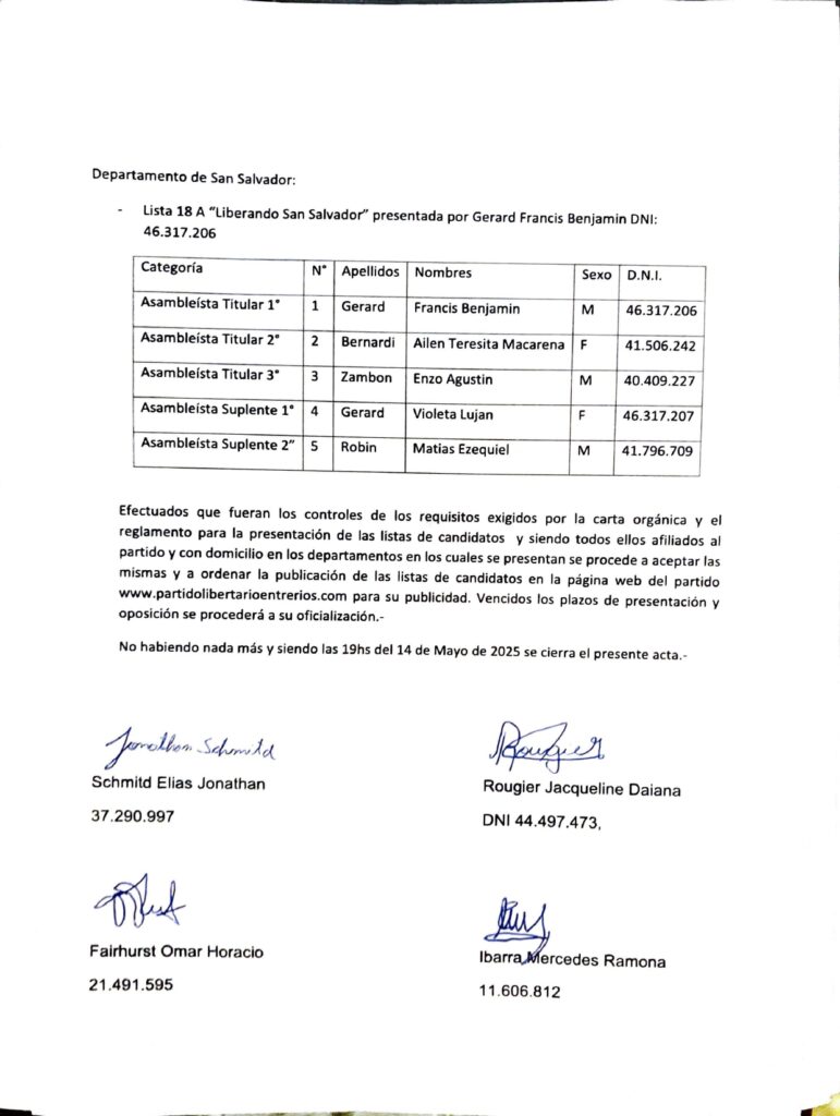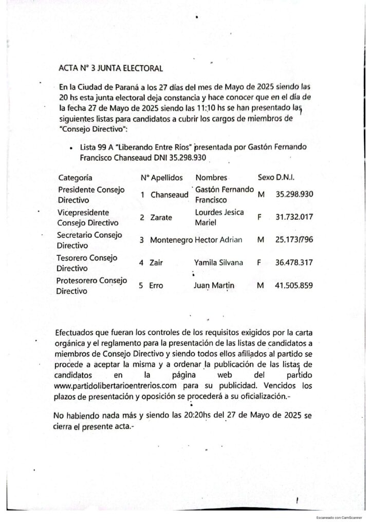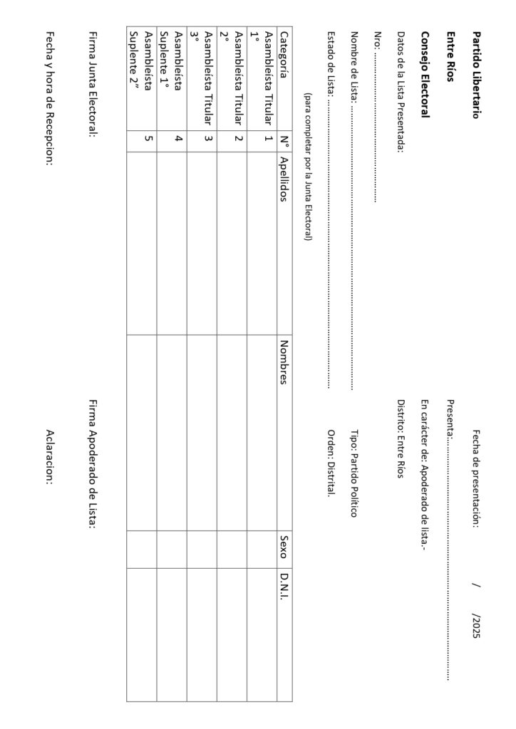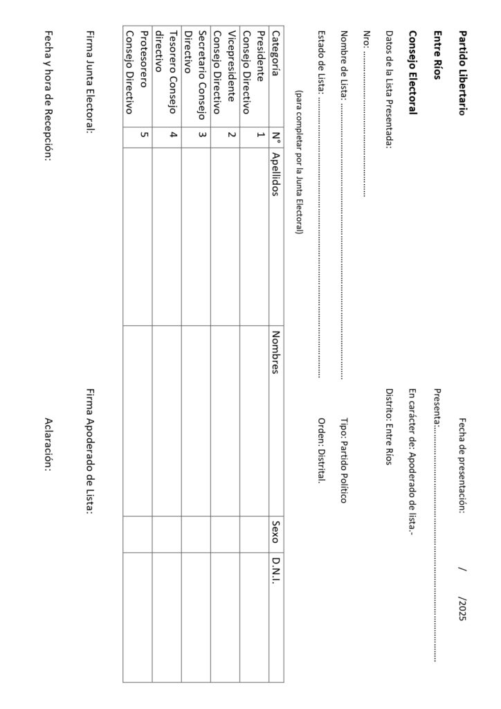 Articulo 3°. LISTA. Se denomina “Lista” a toda lista de afiliados presentada ante la Junta Electoral que busquen acceder a ser electas por los afiliados para ser autoridades del Partido Libertario de Entre Ríos.
