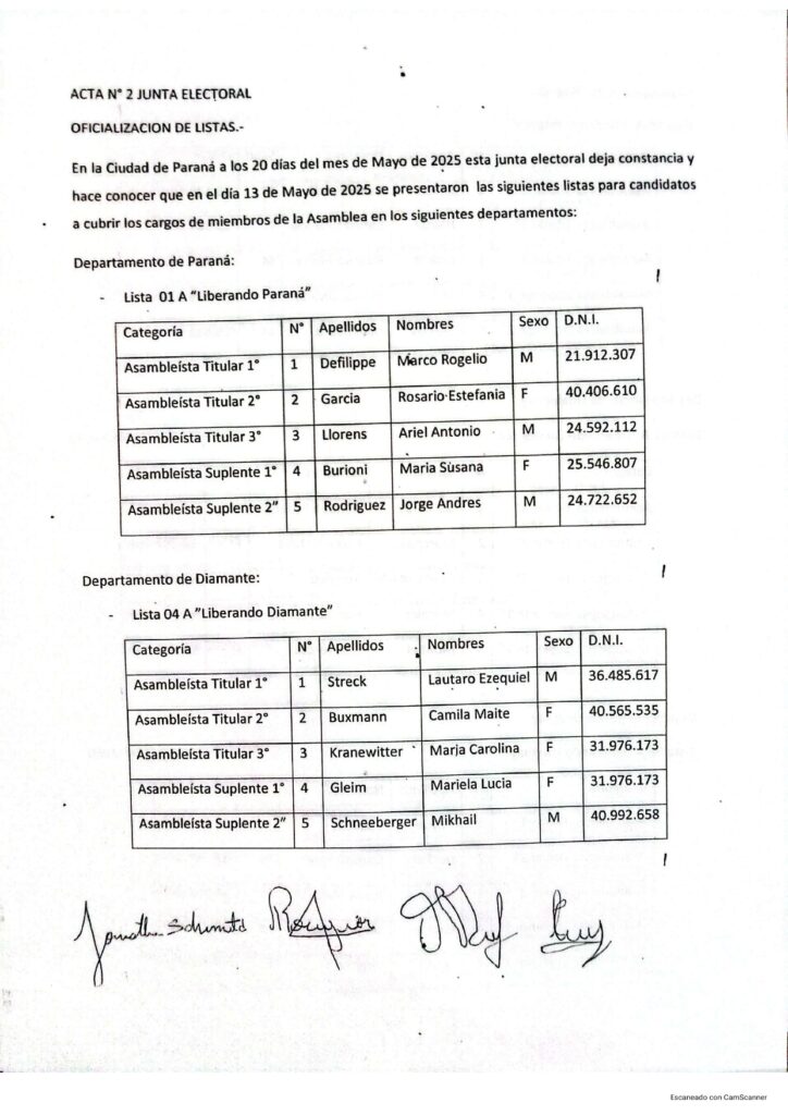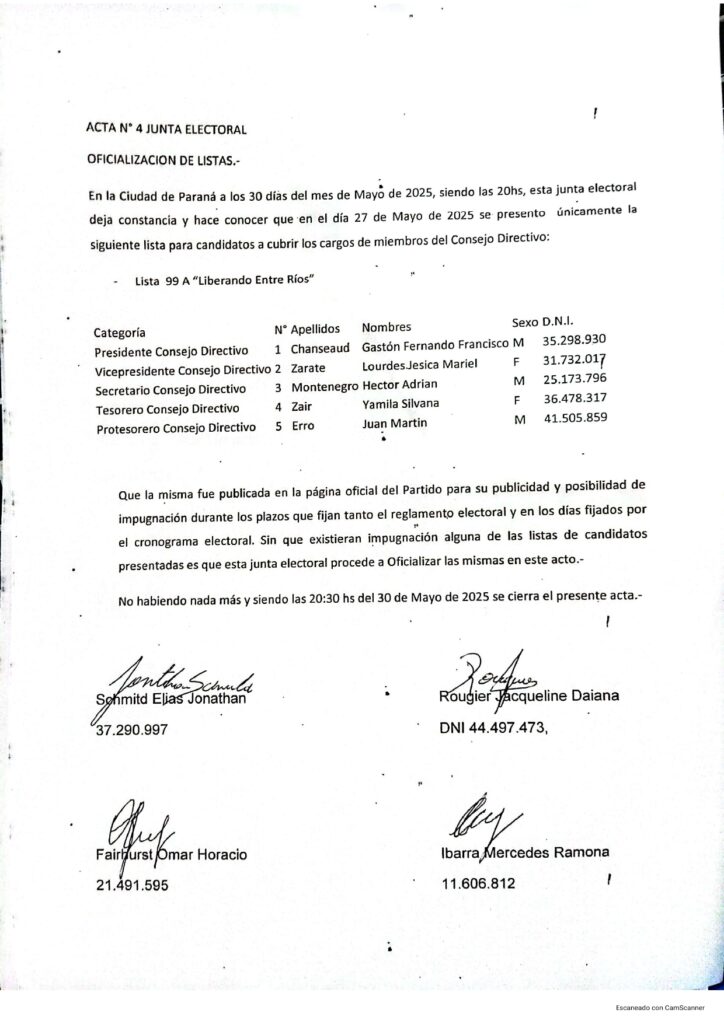 Articulo 4°. LISTA OFICIALIZADA. Se denomina “Lita oficializada” a toda lista de afiliados aprobada por la Junta Electoral que busquen acceder a ser electas por los afiliados para ser autoridades del Partido Libertario de Entre Ríos.