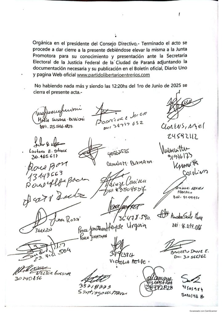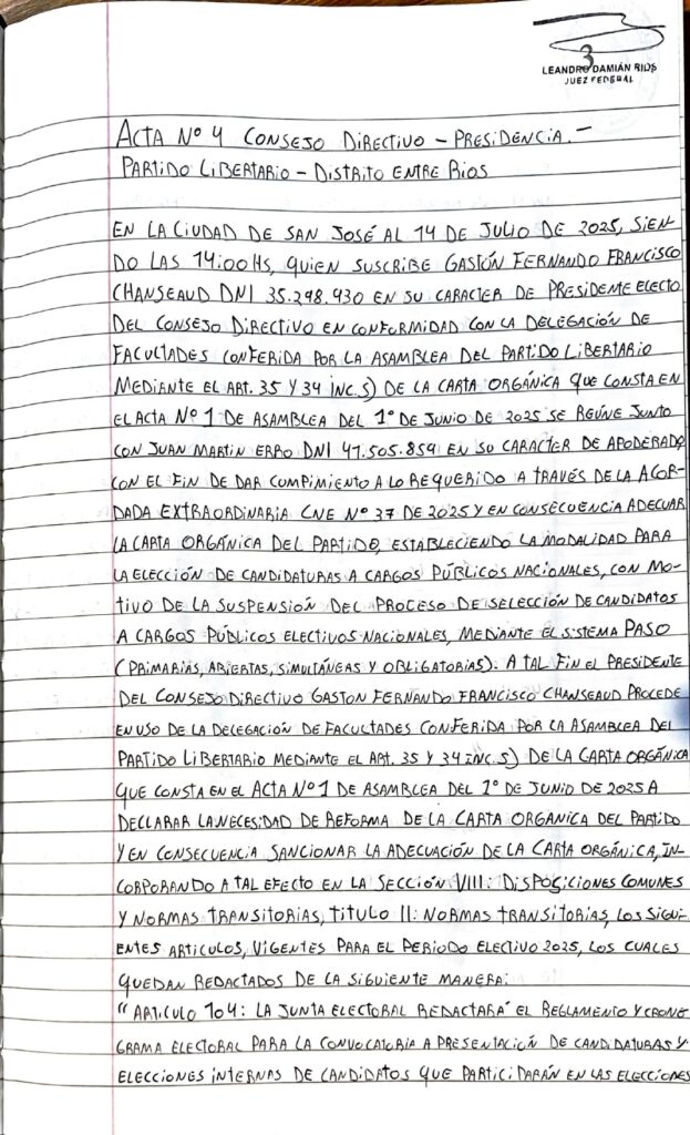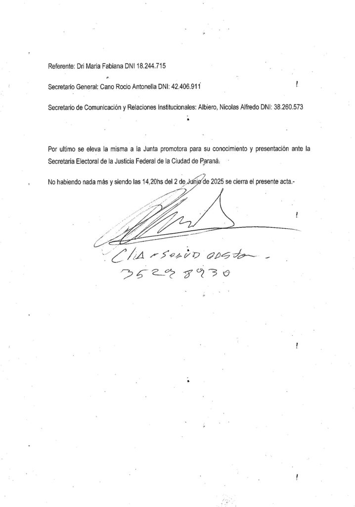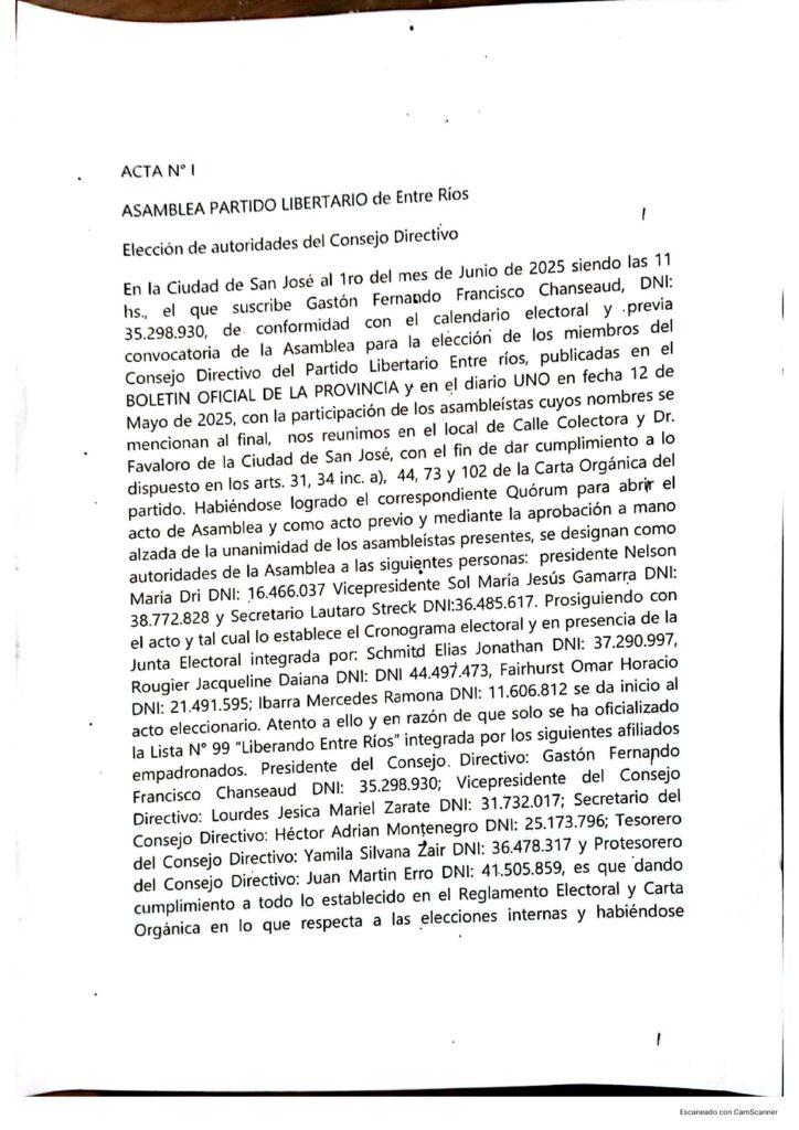 Que el Partido Libertario de Entre Ríos representado por su junta Promotora en su acta con fecha 2 de Mayo de 2025 ha designado cuatro (4) miembros para desempeñar las funciones del Junta Electoral y les ha manifestado ahí mismo la necesidad de preparar un reglamento sobre el desenvolvimiento del proceso eleccionario y publicarlo para que tengan acceso todos los afiliados.